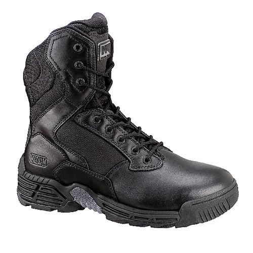 La Magnum Stealth Force 8 Side zip est magnétiquement neutre (ne sonne pas aux portillons d'aéroport). Sa tige est fabriquée en cuir pleine fleur et nylon texturé 1680 deniers. Elle est cousue barbour avec fils résistant aux frottements. La doublure est en cambrelle doublée de mousse avec un traitement anti-bactérien Agion. Les oeillets en composite sont non-magnétiques.