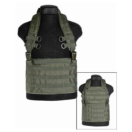Chest Rig MOLLE de la marque Miltec de couleur verte offrant une multitude de possibilités grâce à ses passants MOLLE. Il est tout à fait possible d'enlever une plateforme MOLLE et de la fixer aux boucles D disposées sur les bretelles. Ses bretelles rembourrées et ajustables et sa ceinture réglable vous permettront d'adapter le chest rig à votr morphologie.