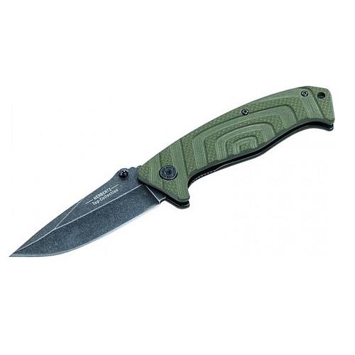 Lame noire acier 440 finition stonewashed à cran intérieur et à bouton plat. Livré avec étui nylon noir et coffret de rangement ABS noir.