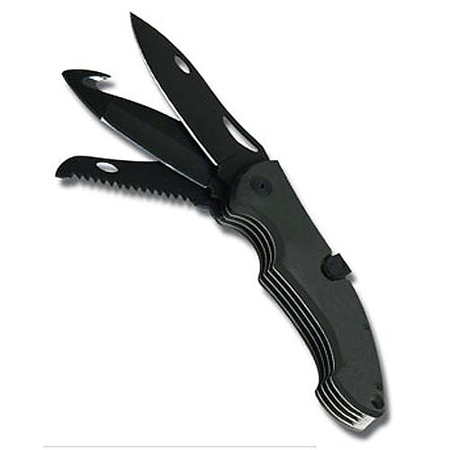 Ce couteau 3 lames comprend une lame droite tranchante, une lame scie et une lame coupe sangle. Chaque lame se bloque par un cran d'arret, avec fermeture sécurisé. Livrée dans un étui cordura noir à position verticale ou horizontale. Couleur: Noir.