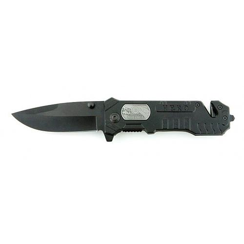Lame pliante téflonée 8 cm. Manche en aluminium avec coupe ceinture et brise vitre. Clip ceinture.