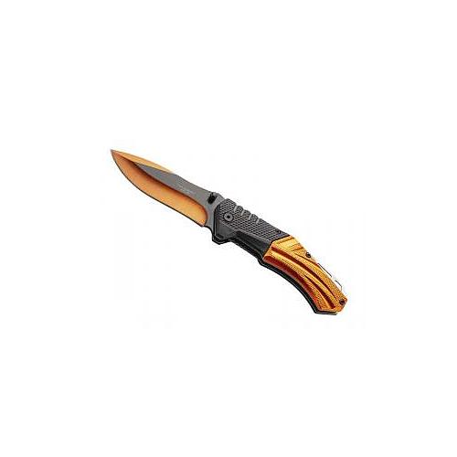 Couteau HERBERTZ, lame orange/noir acier 420 à cran intérieur et à bouton double, manche 12 cm ABS noir avec aluminium orange au recto, avec clip