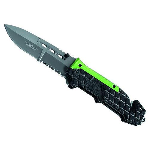 Couteau HERBERTZ, « TOP COLLECTION », lame grise à dents et à trous acier 440 à cran intérieur et à bouton double, manche 12,5 cm aluminium noir insert vert, avec clip, pic brise-vitre en bout et coupe-ceinture de sécurité.