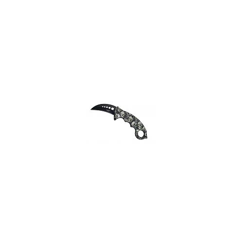 Couteau HERBERTZ Karambit, lame noire à trous acier 420 à cran intérieur avec « flipper », manche 13 cm motif tête de mort avec anneau, avec clip.