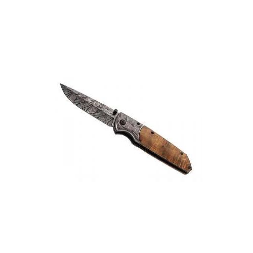 Couteau HERBERTZ, lame décorée acier 420 à cran intérieur et à bouton, manche 12 cm racine de bois avec mitre gravée, avec clip.