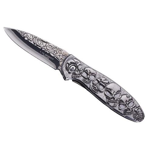 Couteau HERBERTZ, lame acier 420 à cran intérieur, manche 11,5 cm acier inox, décor « tête de mort » avec revêtement titane, avec clip.