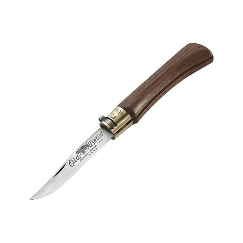 Couteau OLD BEAR taille L, lame acier 420 avec virole de sécurité en laiton (position ouverte/fermée), manche 12 cm noyer traité à l'huile.