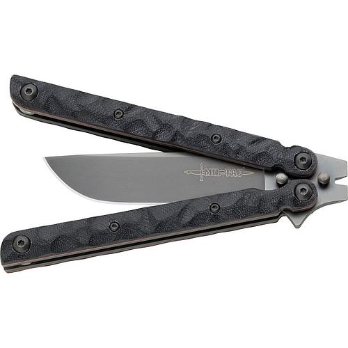 Ce couteau est un couteau papillon .Il a une lame lisse de 9cm. Le couteau a une longueur totale de 21cm.Le couteau est livré dans une boite en fer de protection.