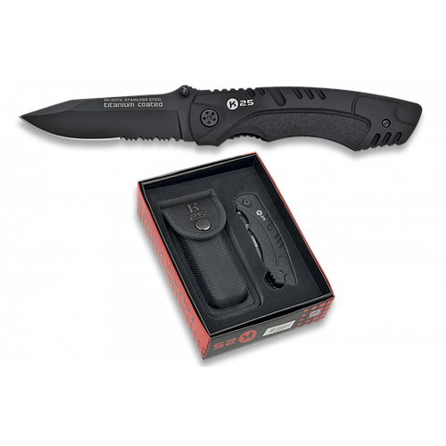 Marque : K25 Type: Couteau Tactique multifonction Manche:Gomme Coated Lame: Aluminium Titanium Coated Taille Lame: 8cm Avec: -Etui du nylon K25 Présentation: Boîte Présentation K25