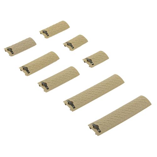 Protège rail ergonomique en nylon couleur coyote. Se fixe directement sur rail picatinny. Peut également servir pour customiser votre réplique ou la rendre plus confortable. 8 pièces : 2 de 145mm, 2 de 95mm, 2 de 75mm et 2 de 55mm de long.