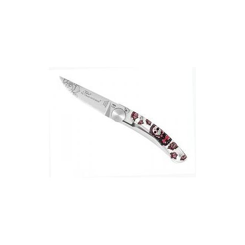 Couteau « Le Thiers® Hipster » par Claude DOZORME, lame acier X50CrMoV15 à cran intérieur (en position fermée la lame entièrement plate du côté du manche reste apparente), manche 10,5 cm habillage inclusion résine avec décor « cavalera », avec clip.
