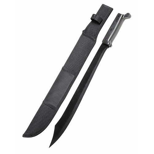 Cette machette possède une poignée est en plastique noir. La lame est en acier inoxydable noir L' épaisseur de la lame est de3 mm Le manche est en nylon La Longueur totale est de 54 cm La Longueur de lame est de40,5 cm Son poids est de 540 grammes.