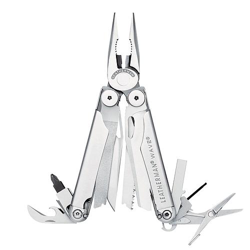Pince Leatherman 'New wave', avec étui cuir. Modèle 18 fonctions, livré avec 2 embouts réversibles.