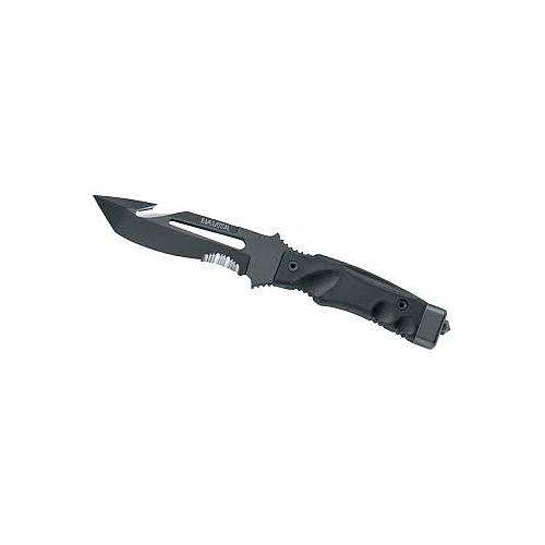 Couteau de 27cm, le Navita se distingue par sa lame atypique de style Tanto qui possède un coupe corde. Celle-ci mesure 13cm de long et fait 6mm d’épaisseur, elle est en acier inoxydable N690Co. Le manche en FORPRENE quand à lui est très ergonomique pour épouser parfaitement la forme de votre main. De plus il est muni d'un brise vitre. La housse livrée avec le couteau permet d’accrocher celui-ci à la ceinture, à la jambe et au bras.