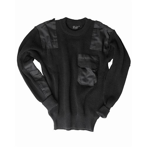 Pull-over BW noir en 100% acrylique. Le pull-over est renforcé au niveau des coudes et des épaules. Il doté d’épaulettes qui s’ouvrent par velcro et d’une poche plaquée sur le cœur se fermant par velcro. Le pull-over possède des bords-côte au niveau des manches.