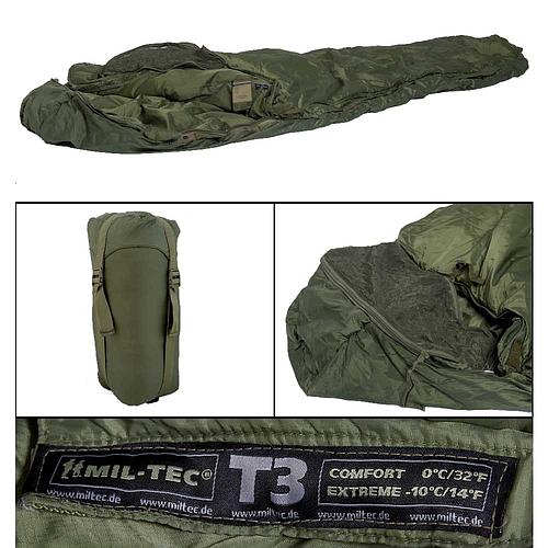 Sac de couchage tactical 3 Miltec. Extérieur: 100% nylon, Doublure: 100% nylon, Garnissage: 100% polyester. Température de confort: 0°C / température extrême: -10°C. Dimensions: 2.2 x 0.7m / conditionné: 40 x 23cm. Poids: 1.77kg. Couleur: vert.