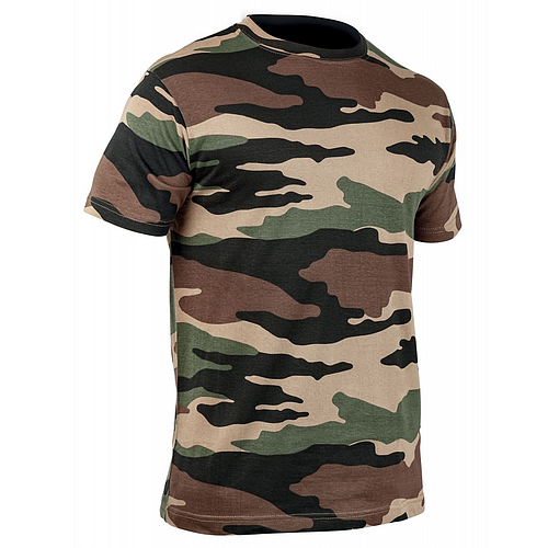 Ce t-shirt camo est en 100 % coton, ultra résistant et de couleur camouflage Centre Europe. Il est de forme tubulaire à col rond et à manches courtes. Pratique et confortable, le T-shirt camo est un produit clé de votre surplus militaire.